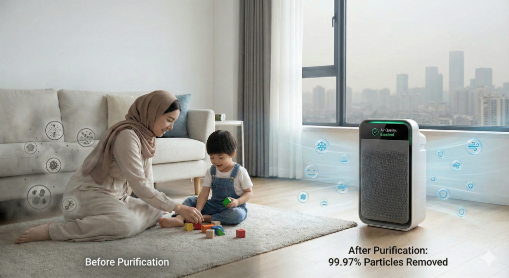 این شاید مهم‌ترین کارکرد دستگاه تصفیه هوا باشد. فیلترهای استاندارد (مانند HEPA) می‌توانند تا ۹۹.۹۷٪ از ذرات آلرژی‌زا مانند گرد و غبار، گرده گل و شوره حیوانات را جذب کنند.